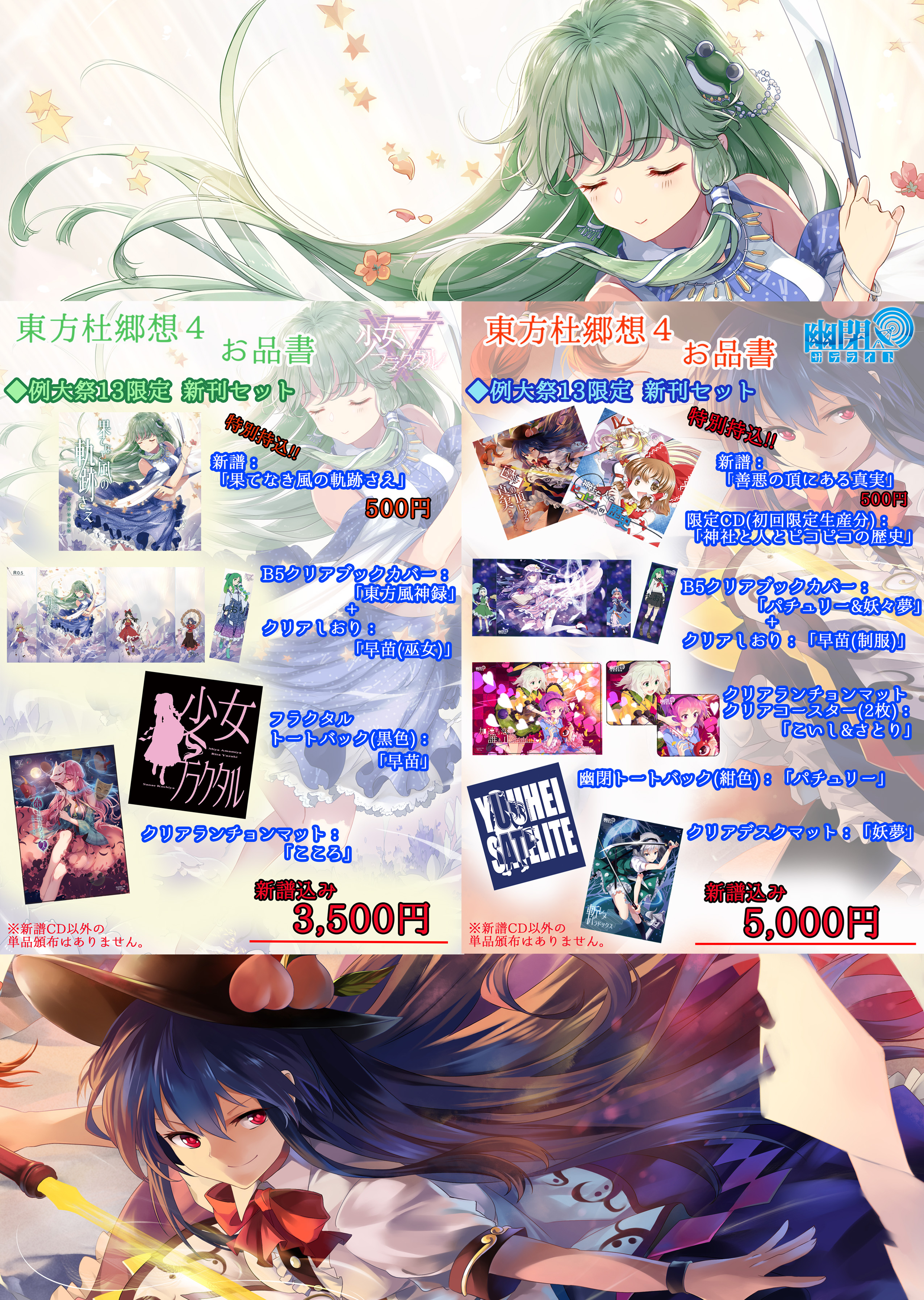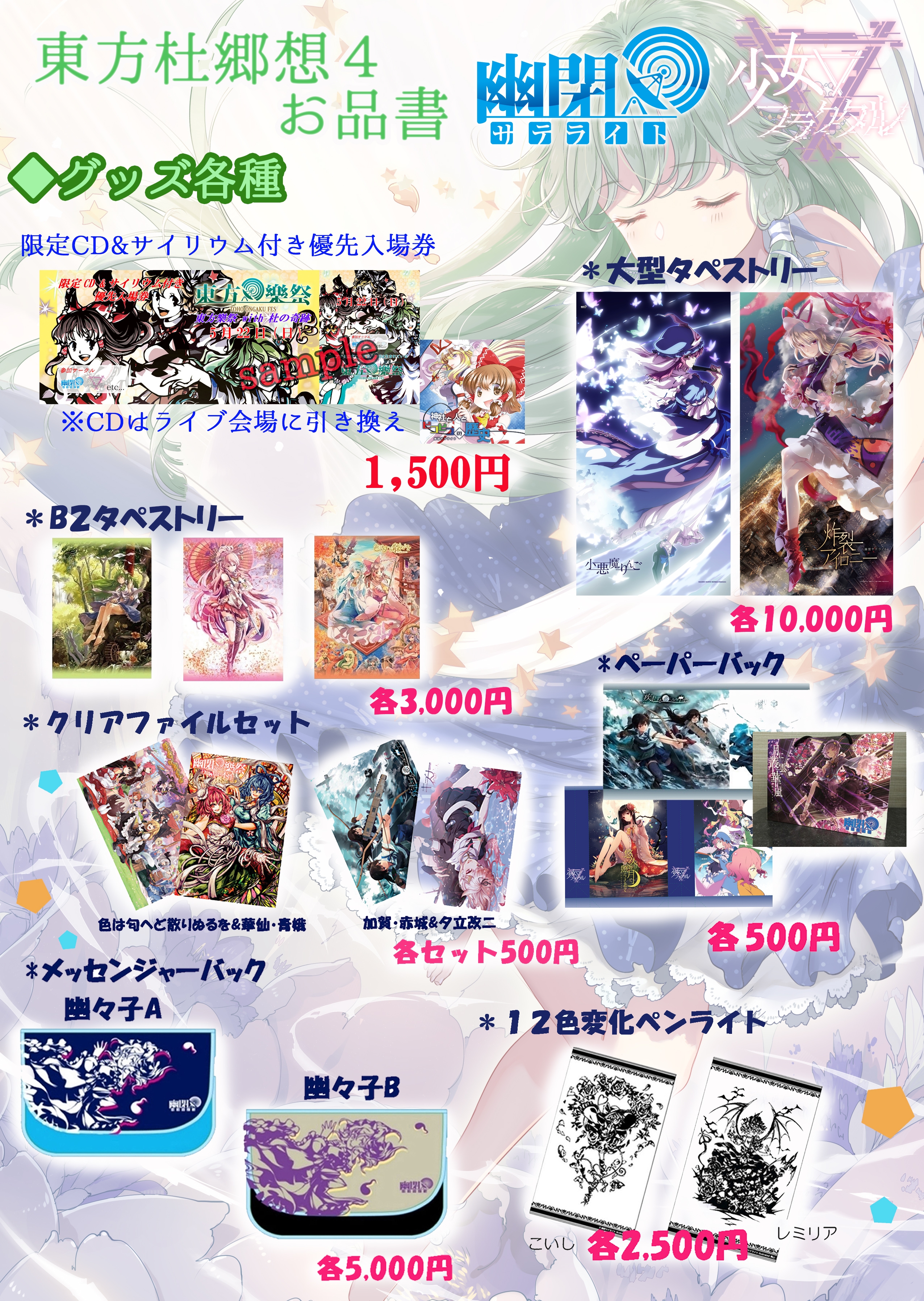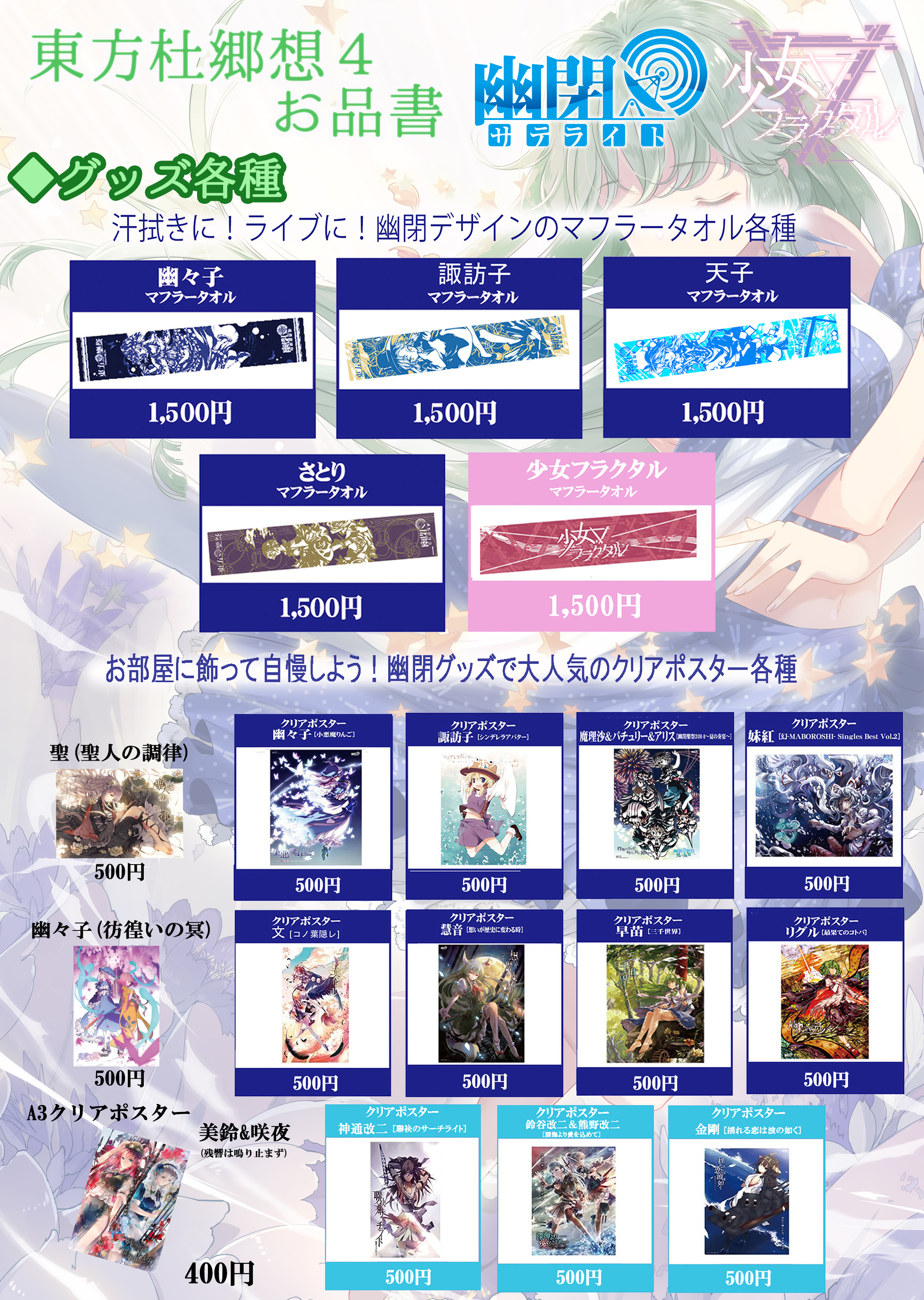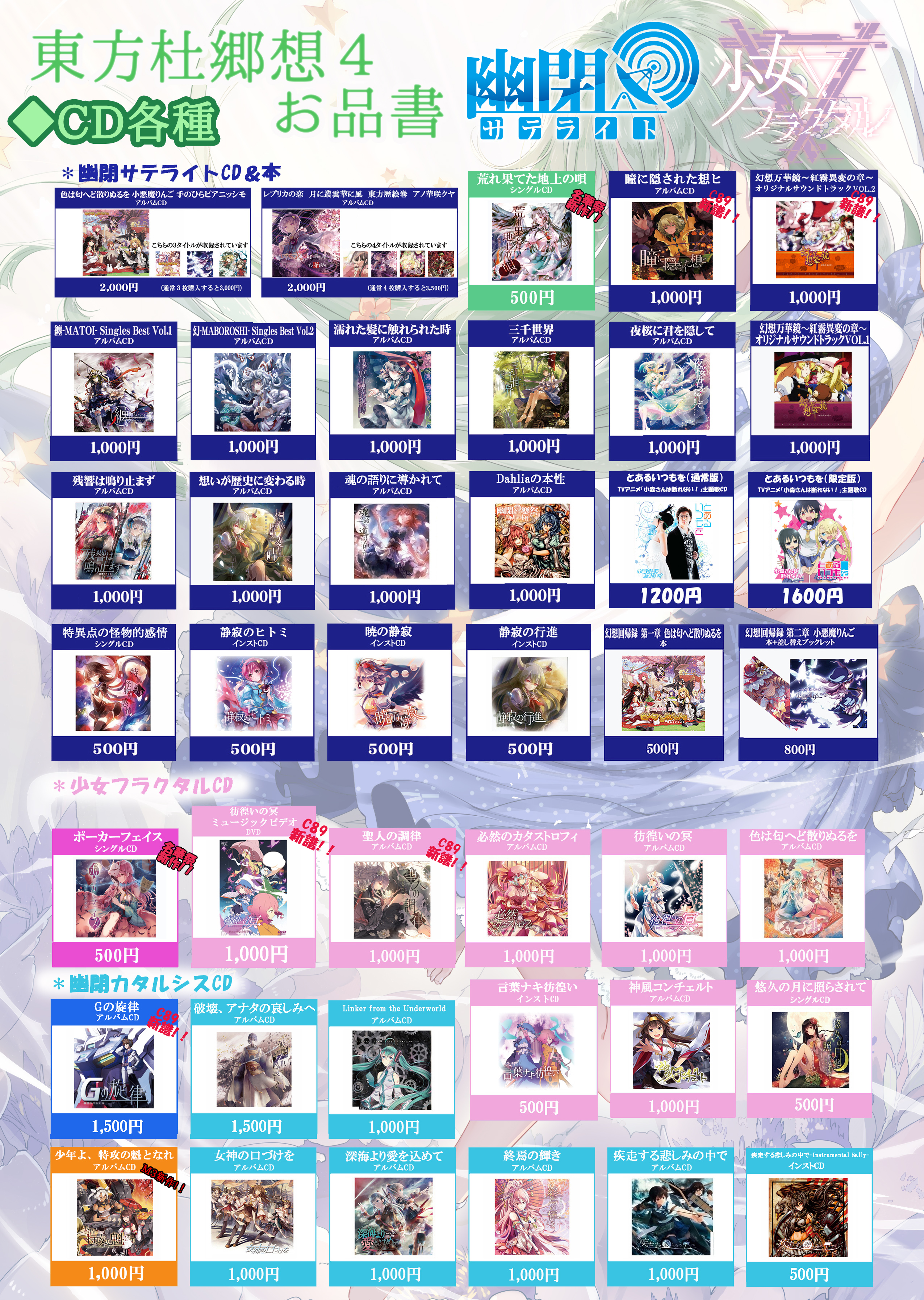 こんにちは幽閉サテライトsatoです! 22日は杜の奇跡に幽閉サテライト&少女フラクタルが参加します! 少女フラクラル 配置:D31 幽閉サテライト 配置:D32 お品書きはこちら イベント詳細はこちら⇒ ーーーーーーーーーーーーーーーーーーーーーー そして、仙台エルパークにてスペシャルな東方樂祭を開催! かませDJ、少女フラクタルでます! 15:30 優先入場 15:45 一般入場 16:00 開演 詳細はこちら⇒ 優先入場券は杜の奇跡でも頒布してますのでよろしくお願いたしますね!!